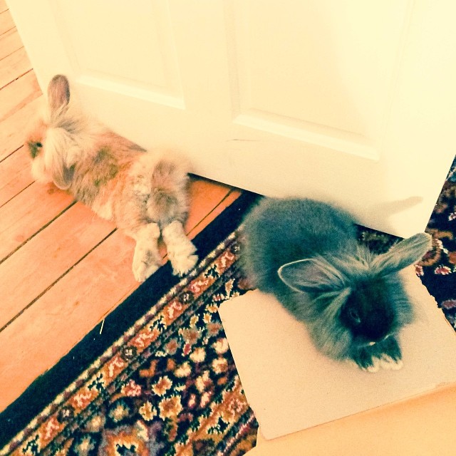 I have two teenage rabbits called Peachy and Buttons, the two most adorable animals that ever lived. Quite contradictory little creatures: gentle yet naughty, quiet yet terrorising. Sweet and small yet able to decimate entire areas. Can’t wait to get them spayed, that’s supposed to settle it all down. They do make great writing companions though, even learning to jump up next to me whilst I work. Today whilst I wrote the new chapter for my book they were settling down for a wee stroke. Cute.